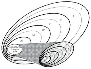 En la Figura 1 se presenta una representación gráfica de los niveles de este modelo, incluyendo su naturaleza recursiva, en el que la comprensión de un concepto se convierte en el Conocimiento Primitivo (CP) de otro concepto.