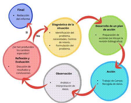 Este trabajo forma parte de un esfuerzo más amplio de investigación-acción, y aquí se reporta un ciclo completo de investigación-acción (ver Figura 2). Las fases que se aplicaron son las planteadas por Colás Bravo y Buendía Eisman (1994), que se describen a continuación: