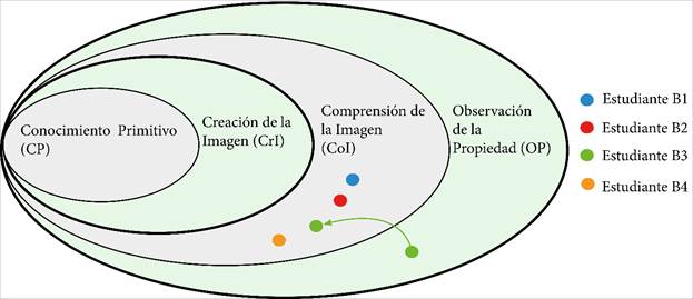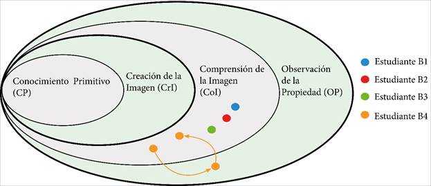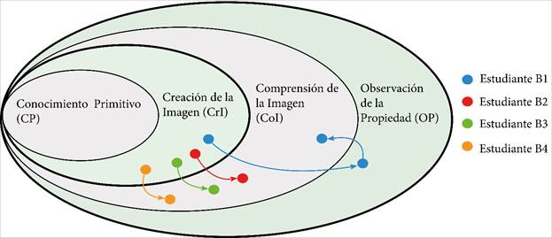 El estudiante B4, al requerir un dibujo de un termómetro para intentar representar los datos del problema, muestra que no podía relacionar simbólicamente las operaciones ni interpretar mentalmente la situación, lo que lo ubica en el nivel CrI. Los demás estudiantes, al construir en equipo lo que B4 había propuesto, indican requerir también una representación física del termómetro, por lo que también se encuentran en el mismo nivel en ese momento. Sin embargo, el estudiante B1, al expresar una suerte de generalización de la situación, se desplaza al nivel OP, aunque la propiedad enunciada es incorrecta. Después de la intervención del profesor, B1 rechaza lo que dijo el profesor y, al igual que él, los demás estudiantes aceptan la propiedad enunciada, y descartan el dibujo. Con esto parecieran avanzar también a OP, pero en realidad indica, una vez más, que todos no logran razonar y armonizar sus imágenes mentales, aunque sí las tienen, por lo que se desplazan todos hacia CoI en este momento. Este proceso se representa gráficamente en la Figura 12.