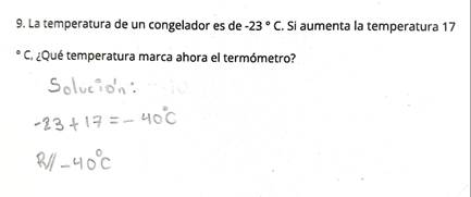 GB-Prof-23: “En este caso también deben de aplicar la ley de los signos de la suma que se aprendieron y que la maestra les preguntó” (Los estudiantes sabían de memoria la ley de los signos, pero no entendían cuál era el procedimiento para sumar un número negativo con un positivo, y no consideraron el signo del mayor. Luego procedieron como indicó B1, dejando incompleto el dibujo del termómetro, ya que no lograron dibujar la escala).