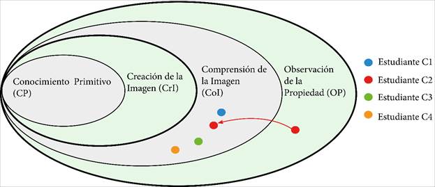 El estudiante C4 menciona una propiedad –incompleta o fragmentada– que relaciona los pares ordenados con el plano cartesiano, pero de inmediato se da cuenta que aún no sabe quiénes son x y y en él, lo que indica que no sólo la propiedad no está clara en su mente (así que no puede estar en OP), sino que todavía no tiene bien definida una imagen mental que le permita llegar a la relación (propiedad) horizontal-es-x y vertical-es-y. Esto lo sitúa en el nivel CrI en ese primer momento. El estudiante C1 se ubica en el nivel OP al mostrar tener clara la propiedad que C4 no recordaba completamente. Luego, C4 avanza al nivel CoI, ya que acepta lo que C1 ha dicho. Esto es así, porque ahora C4 ya tiene esa imagen mental. En un primer momento, para los estudiantes C2 y C3, al no expresarse verbal ni físicamente, no se pudo determinar su nivel de comprensión. Pero luego, al estar de acuerdo con lo que complementó C1, se ubican en el nivel CoI (porque se asume que al menos ahora sí tienen esa imagen, igual que C4), y no en OP, ya que no hay evidencia, en ese momento, de que hayan asimilado la generalización de la propiedad complementada por C1. Sin embargo, el estudiante C2, al generalizar aún más sobre las características de las coordenadas en el plano cartesiano, avanza al nivel OP, aunque se trata de una propiedad errónea. No obstante, al no considerar el signo de las coordenadas ni la intervención del profesor, en realidad los estudiantes C3 y C4 se mantienen en el nivel CoI, y C1 y C2 bajan de OP, porque no logran razonar sobre sus imágenes mentales incorrectas. Este complejo proceso se presenta gráficamente en la Figura 7.