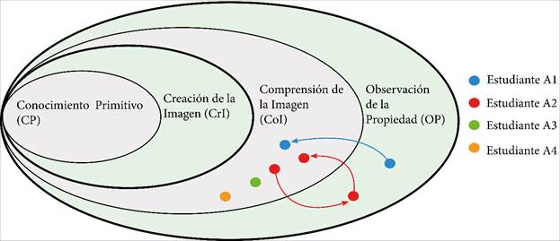 ● Observación de la Propiedad (OP): Análisis de imágenes mentales para identificar y relacionar atributos, llevando a definiciones informales del objeto matemático. Es cuando los estudiantes ya han interiorizado alguna propiedad que relaciona diferentes imágenes mentales, y son capaces de generalizarlas (aunque estén equivocadas).