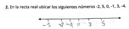 P2. En la recta real ubicar los siguientes números –2, 5, 0, –1, 3, –4. [Se anexa un segmento de recta con flechas en los extremos, sin etiquetas y sin marcas]