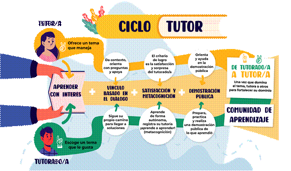 Es importante señalar que, en esta metodología, el ciclo del trabajo tutor (ver Figura 1) es un proceso formativo en el cual se rompen jerarquías y se genera una relación tutora en la cual todas y todos pueden aprender. Hay que destacar que esta dinámica conecta con una nueva praxis pedagógica que permite la autonomía, libertad y democratiza el proceso de aprendizaje (Carro Olvera y Lima Gutiérrez, 2024).