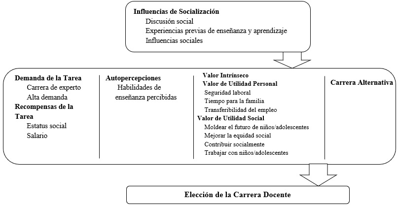 Uno de los trabajos más destacados sobre las motivaciones para elegir la docencia es el de Brookhart y Freeman (1992), quienes desarrollaron el estudio titulado “Characteristics of entering teaching candidates” (Características de los candidatos que ingresan a la enseñanza). Posteriormente, Watt y Richardson (2007) ampliaron este enfoque mediante la escala FIT-Choice (Factors Influencing Teaching Choice Scale, Escala de Factores que Influyen en la Elección de la Docencia), como se observa en la Figura 1. Esta escala está basada en la teoría del valor de las expectativas, y considera la utilidad personal, el valor de la utilidad social, la exigencia de la tarea y el retorno del trabajo como elementos clave en el momento de elegir la docencia.