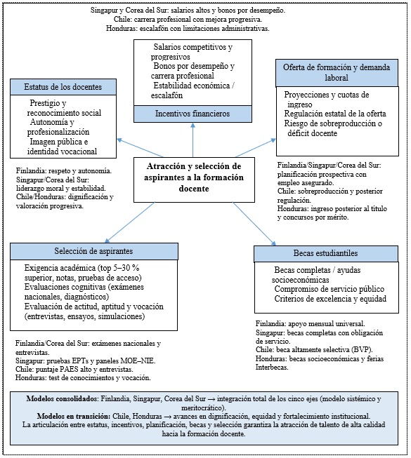 Nota. El esquema sintetiza los factores comunes y diferenciadores en torno al estatus docente, incentivos financieros, oferta formativa, becas y criterios de selección en Finlandia, Singapur, Corea del Sur, Chile y Honduras.