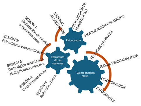 Se verificó que el dispositivo implementado, concebido bajo la analogía de una máquina, tiene componentes claves que se muestran en la Figura 1. Los engranajes simbolizan los componentes clave, la estructura de las sesiones y el psicodrama, los tres ejes principales de la intervención.